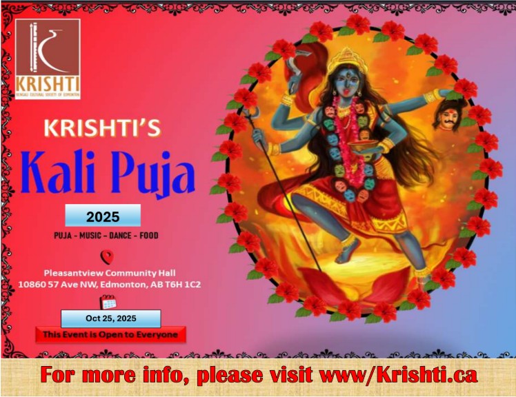 'Kali Puja' will be celebrated on October 25, 2025 (Saturday) from 6 PM at Pleasantview Community Hall (10860 57 Ave NW, Edmonton, AB T6H 1C2). The event will be filled with puja celebration, cultural programs and delicious foods. Please note that due to the limited capacity of the venue and to respect the fire code regulation, we will have a 'first come first served' basis confirmation for this event. We will close the entry once we reach the max capacity of the hall.